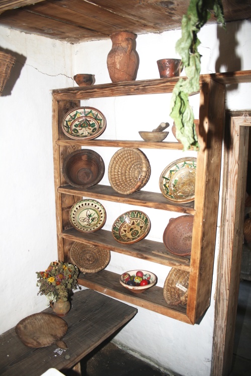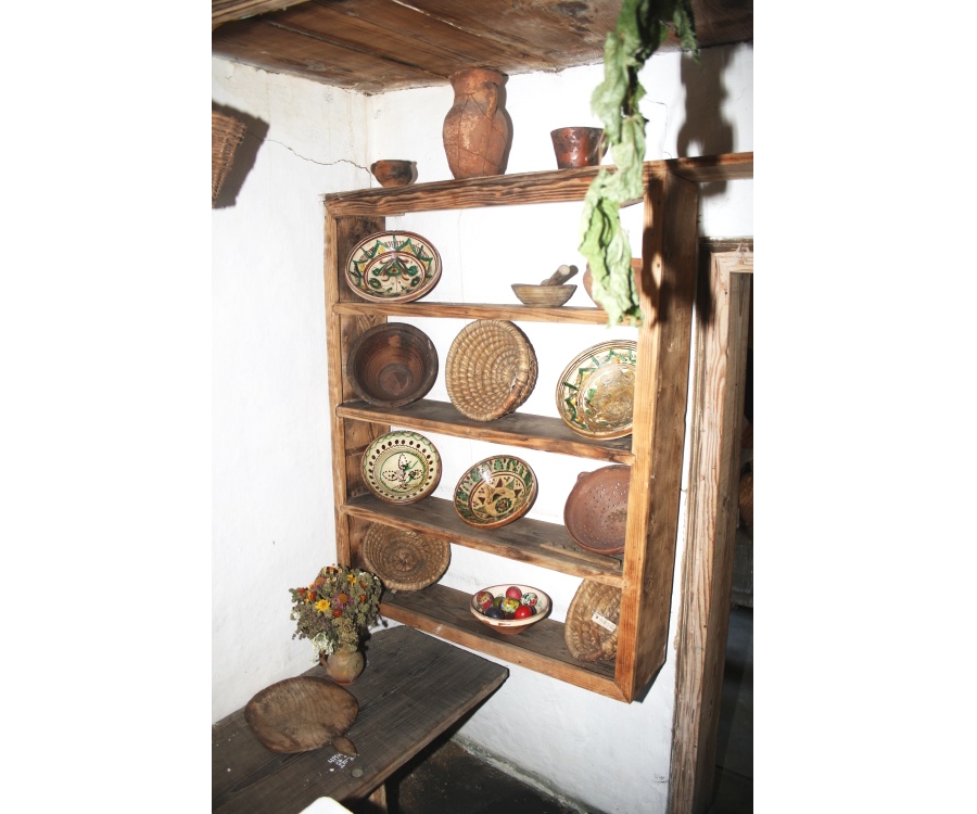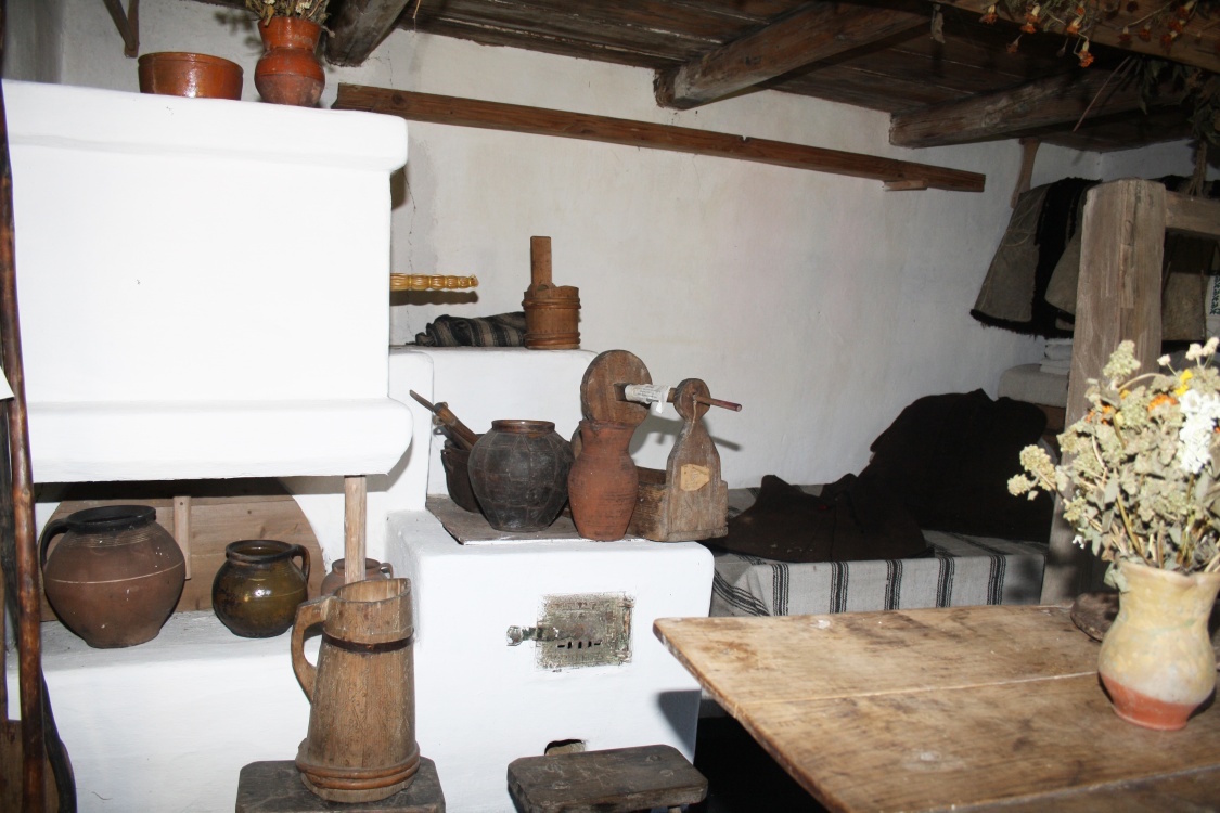 Мало не третину приміщення займає піч зі шпаргатом та місцем для спання. Біля печі – звичне знаряддя праці господині – лопата для хліба, кочерга. Праворуч від входу мисник, далі – стіл з лавами, над столом – образи. Навпроти печі, у теплій частині приміщення – постіль, застелена веренею, біля неї підвішена колиска. На жердці розвішаний буденний одяг: сорочки, портяниці, горботки, сардаки.