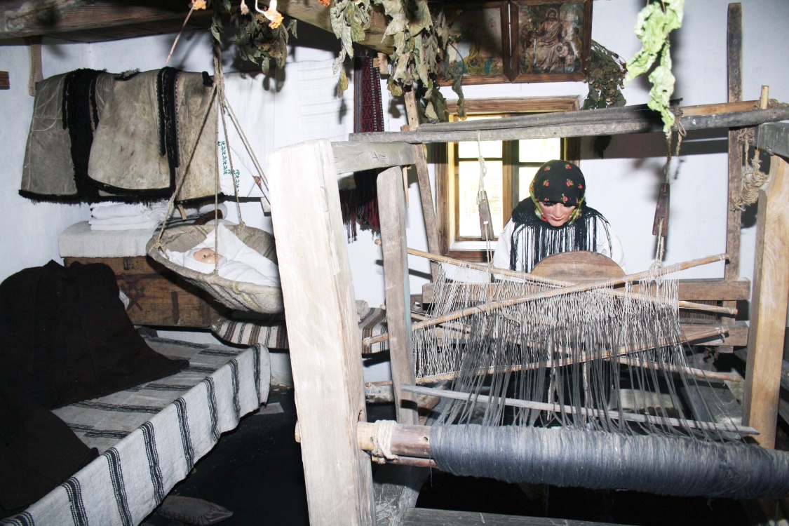 Посеред хати – кросна – горизонтальний ткацький верстат, який займає весь вільний простір кімнати. Довгими зимовими вечорами господиня пряла та ткала, заробляючи якусь копійчину. Пряла на прядці – кужівці, змотуючи нитку на веретено. Для кужівки робились спеціальні отвори в лаві біля вікна. Кросна бралися в оренду у багатших селян на умовах відробітку. Жінка мала наткати полотна та інших виробів для багатія, що дав їй для роботи ці кросна.