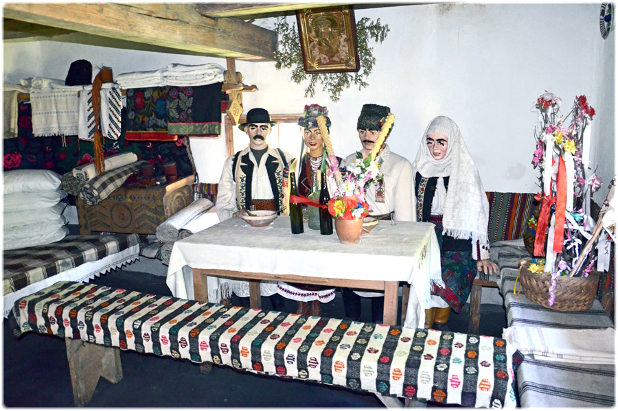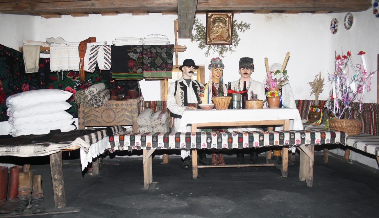 В інтер’єрі великої хати відтворено фрагмент обряду весілля. За святковим столом сидять молодята у святковому вбранні, поряд – вінчальні батьки. На столі – два великих калачі ( ритуальний хліб, що є обов’язковим атрибутом всіх обрядових дій та символізує достаток та добробут родини), дві пляшки з вином, зв’язані навхрест червоною стрічкою як символ поєднання долі молодят, великі весільні свічки. Біля столу на покуті весільне деревце «гільце», символ вічності та невмирущості життя.
