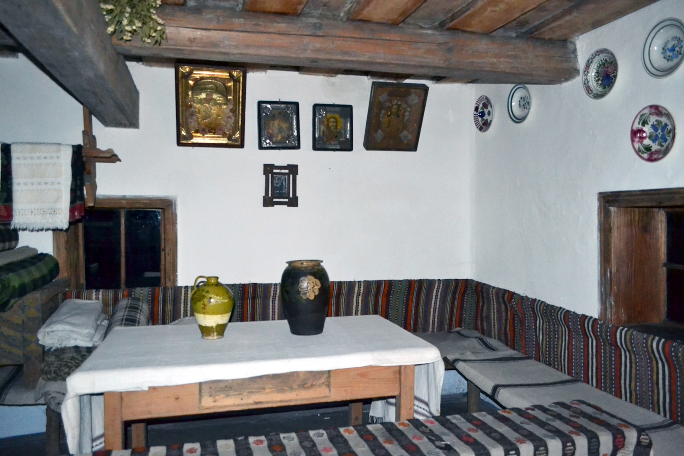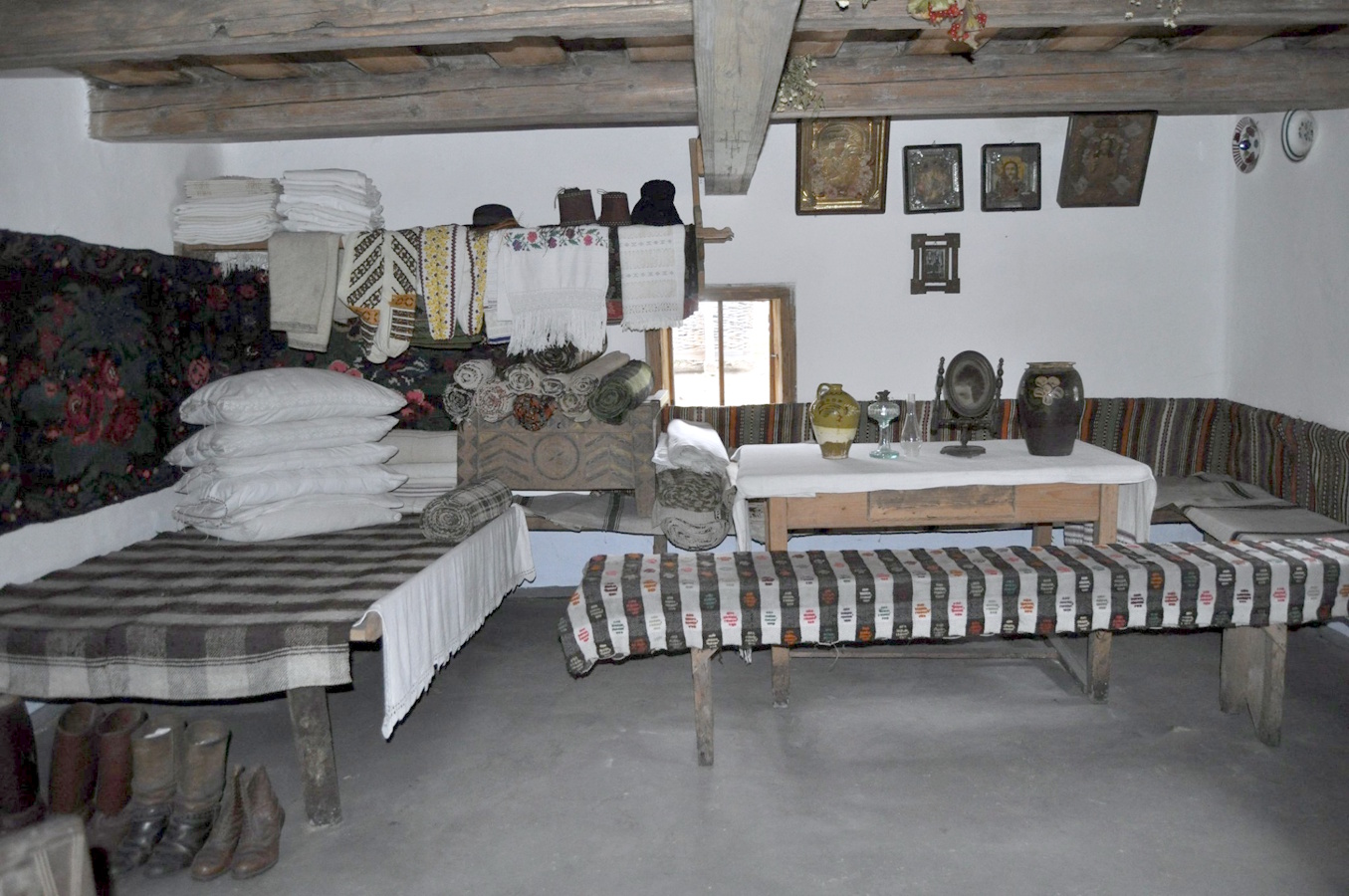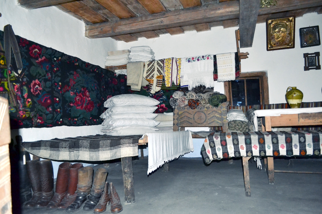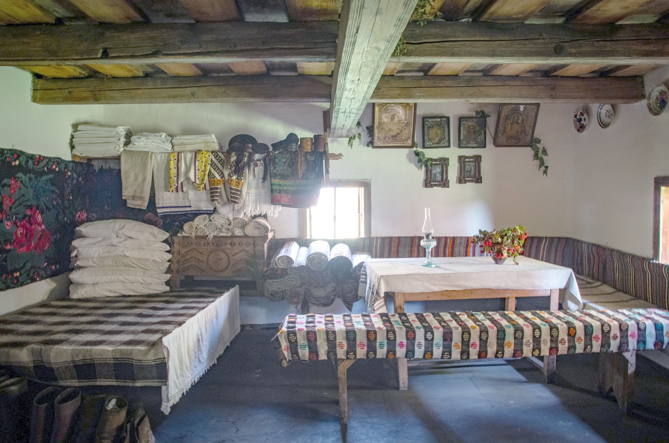 Окрасою великої хати – світлиці є коверець з зображенням великих яскравих руж в обрамленні квіткових гірлянд. Постіль з гіркою подушок, на жердці – святкове вбрання, мисник з розмальованим посудом, налавники створюють своєрідну атмосферу, виконуючи не тільки функціональне а й естетичне призначення.