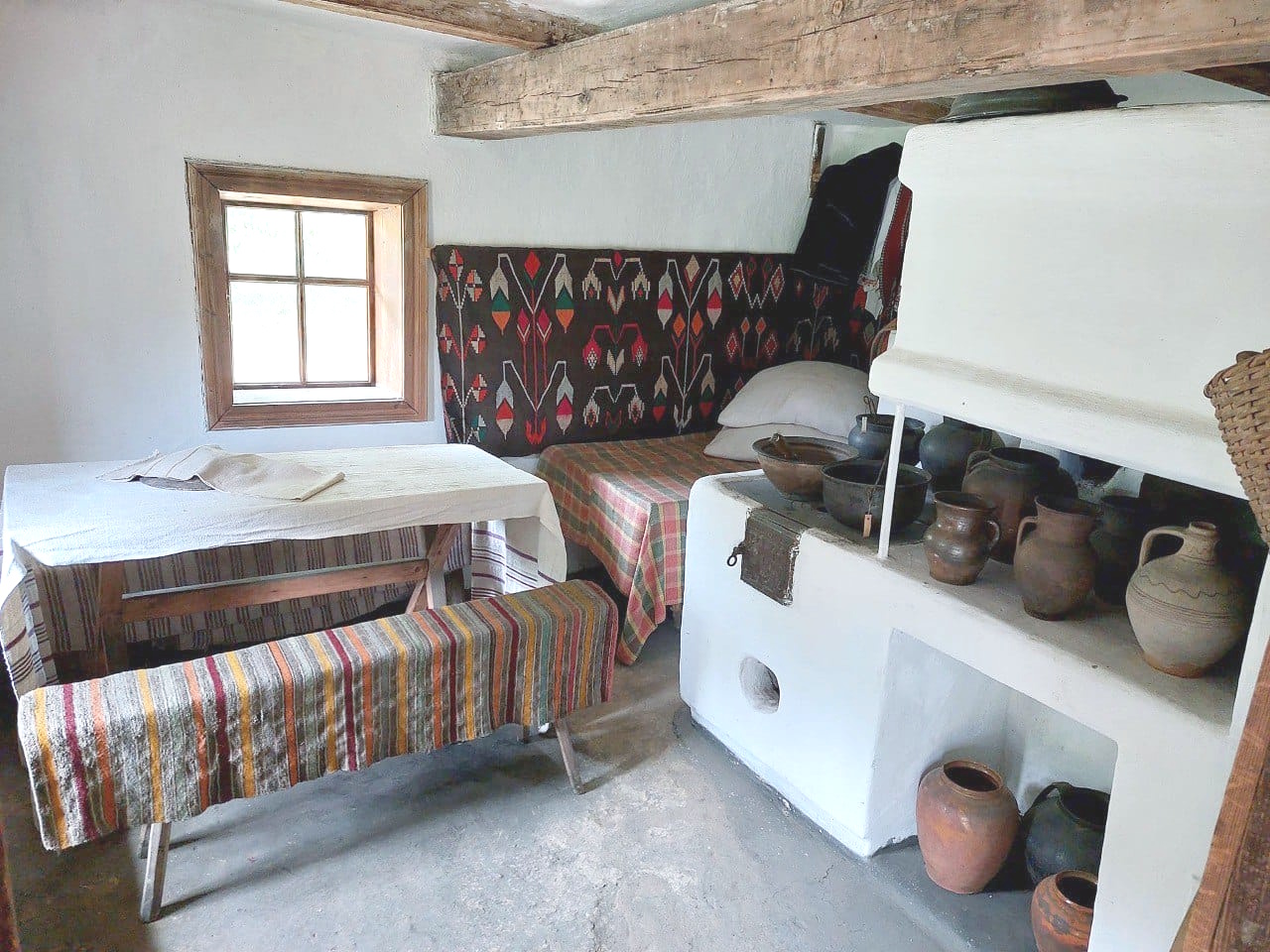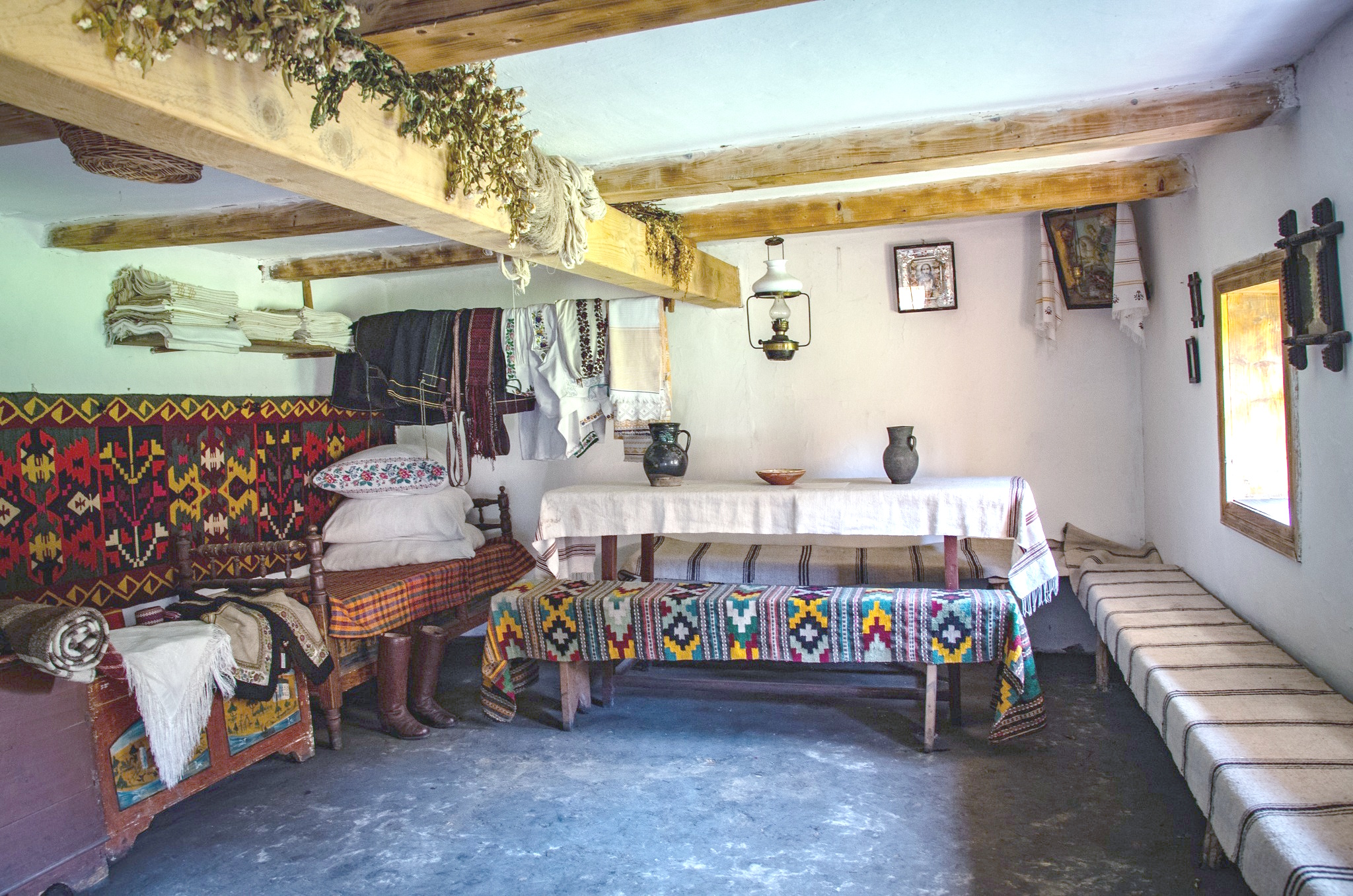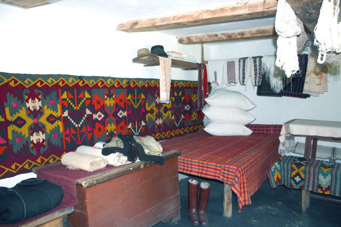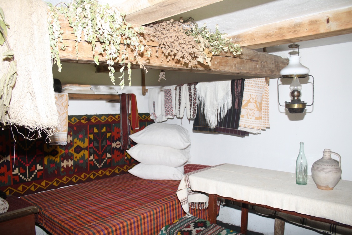 Інтер’єр цього приміщення щедро оздоблений тканими виробами – килимами, картатими налавниками та залавниками. В хаті – дві скрині із різним добром, на жердці над ліжком розкладений святковий одяг: вишиті сорочки, горботки, пояси.