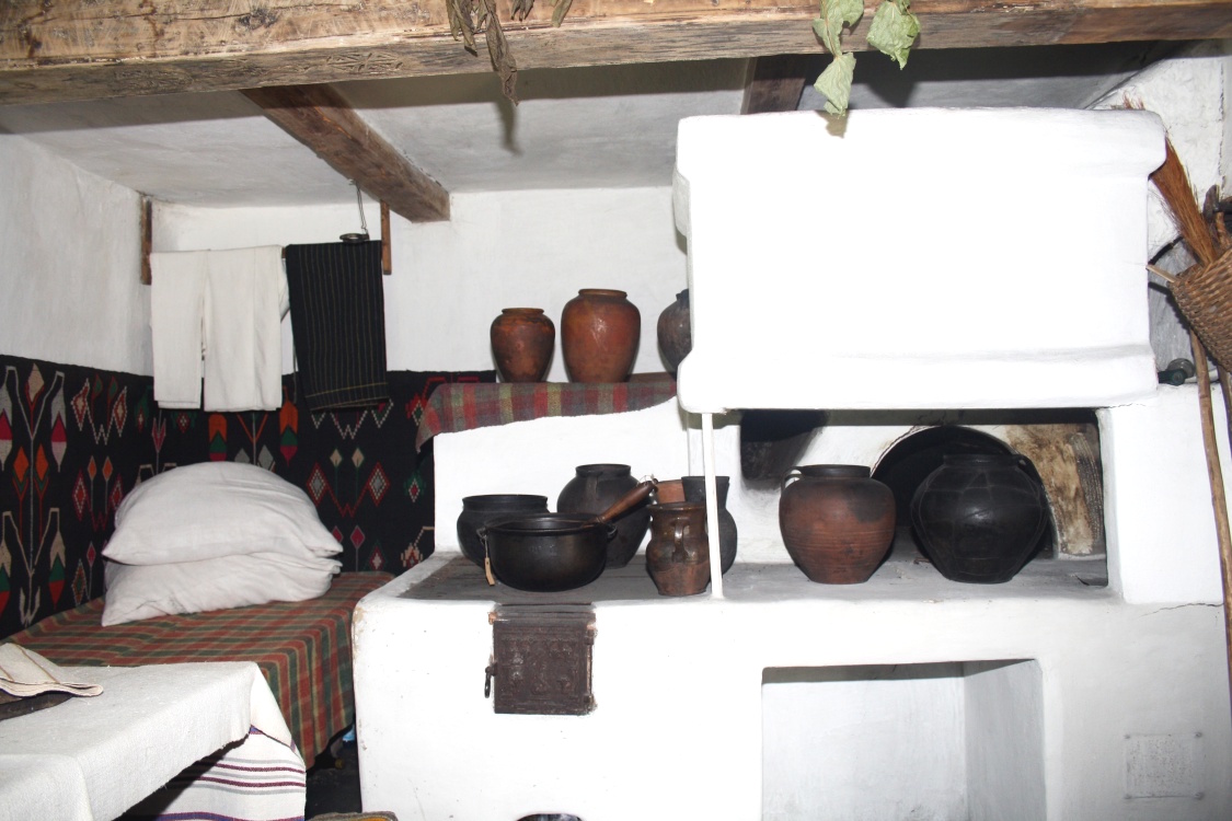Внутрішнє планування, що складалось протягом століть, характеризується значною однотипністю для різних регіонів. У житловій кімнаті – «хатчині» праворуч входу – піч із горном та шпаргатом, яка опалювала приміщення взимку та слугувала для приготування святкових страв, випічки хліба. На шпаргаті (мала піч з металевою плитою) готували буденні страви та корм для худоби. Дим із печі виходив у сіни через спеціальний отвір у стіні – «каглу», далі – через виплетений із лози димар назовні. В димарі, який в нижній ширшій свої частині обмащений глиною, могли коптити м’ясо та сало.