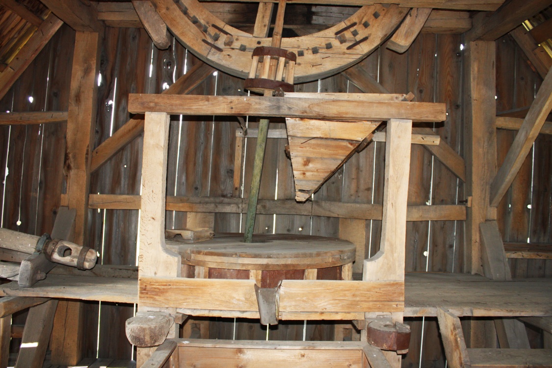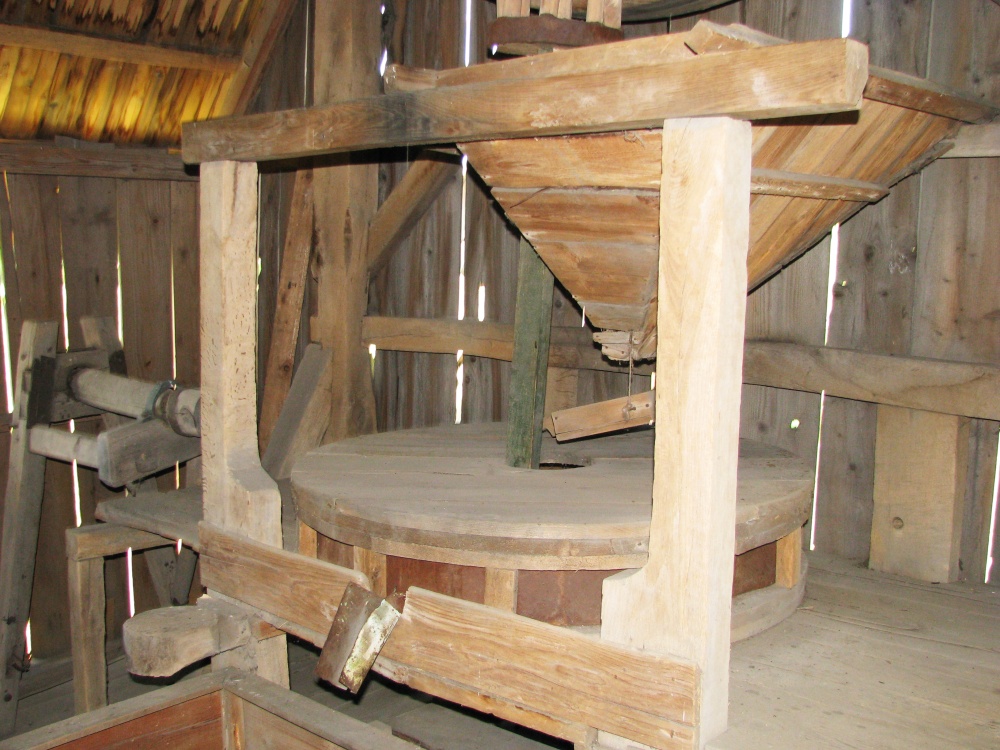 Основну частину приміщення другого поверху займає борошномельний механізм. Під дахом млина проходить масивний дубовий вал, на якому закріплено дерев’яне зубчате колесо. Назовні млина на цьому валі кріпляться крила вітряка (їх було – 4,6,8). Вітер спричинює обертання крил та відповідно приводить до руху зубчате колесо, яке в свою чергу, завдяки спеціальному пристрою, що звався «веретеном», рухає жорна – два округлі притесані один до одного камені, між якими, власне, перетирається зерно на борошно. Нижній камінь – нерухомий. У верхньому, рухомому – спеціально видовбано відповідного діаметру отвір, через який зерно з ковша попадає між жорна та розтирається. Щілина між жорнами регулювалась, таким чином обиралась якість помелу (грубший – крупа, тонший – борошно).
